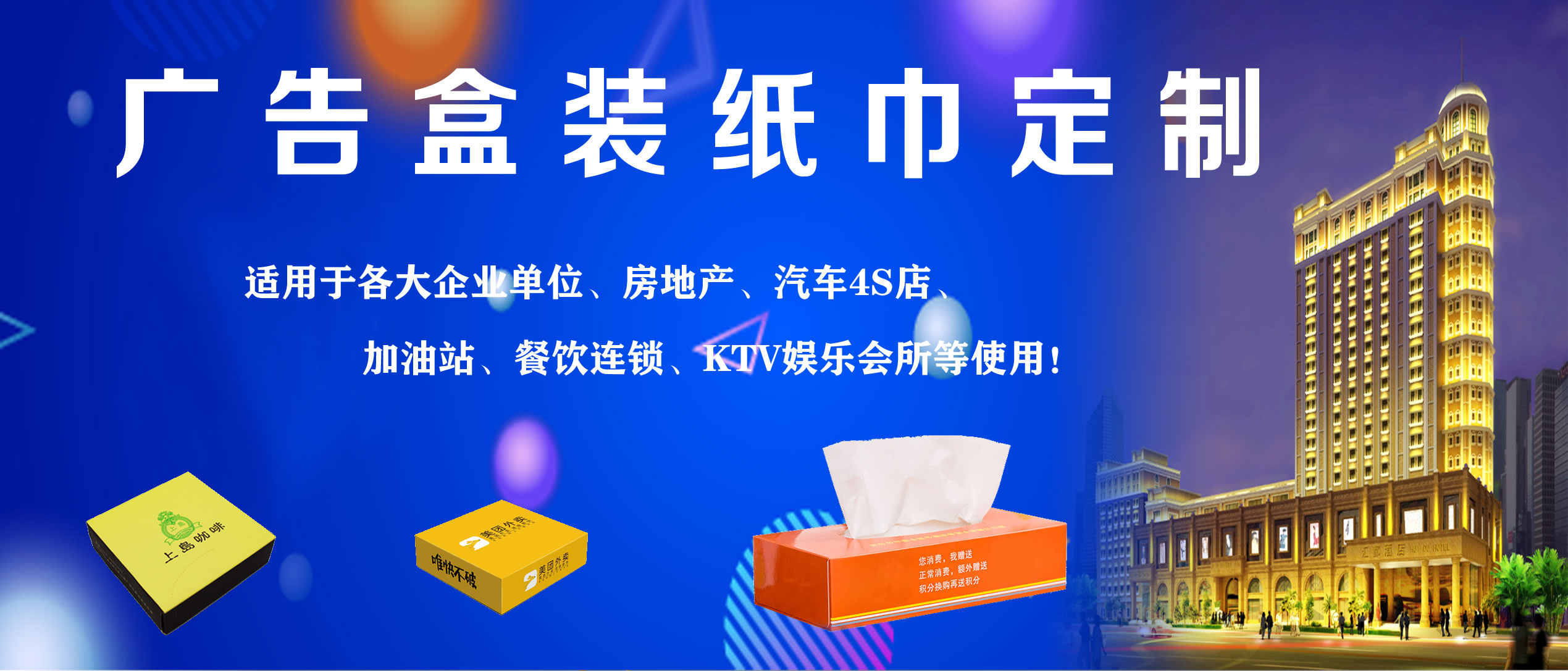 合肥億竹紙品包裝有限公司是一家專業(yè)從事各種生活用品定制的企業(yè),定制熱線:18919603840(周經(jīng)理)。公司與各大餐飲行業(yè)、酒店、加油站、學(xué)校、KTV娛樂會所、銀行、汽車4S店、房地產(chǎn)、廣告公司等客戶長期合作,業(yè)務(wù)覆蓋安徽全省。公司主營產(chǎn)品:廣告盒抽定制、餐巾紙定制、大盤紙、擦手紙、散抽紙等。有著完善的生產(chǎn)硬件設(shè)備和專業(yè)技術(shù),及長期從事的豐富經(jīng)驗。 我廠專注生活用品多年,致力于生產(chǎn)“精致,高端,綠色,健康”于一體的優(yōu)質(zhì)產(chǎn)品,以誠信、實力和產(chǎn)品質(zhì)量獲得業(yè)界的認(rèn)可。目前我廠產(chǎn)品已深得寶馬汽車、重慶劉一手火鍋餐飲連鎖、萬達集團、綠地集團等眾多客戶的青睞,業(yè)務(wù)量不斷攀升。